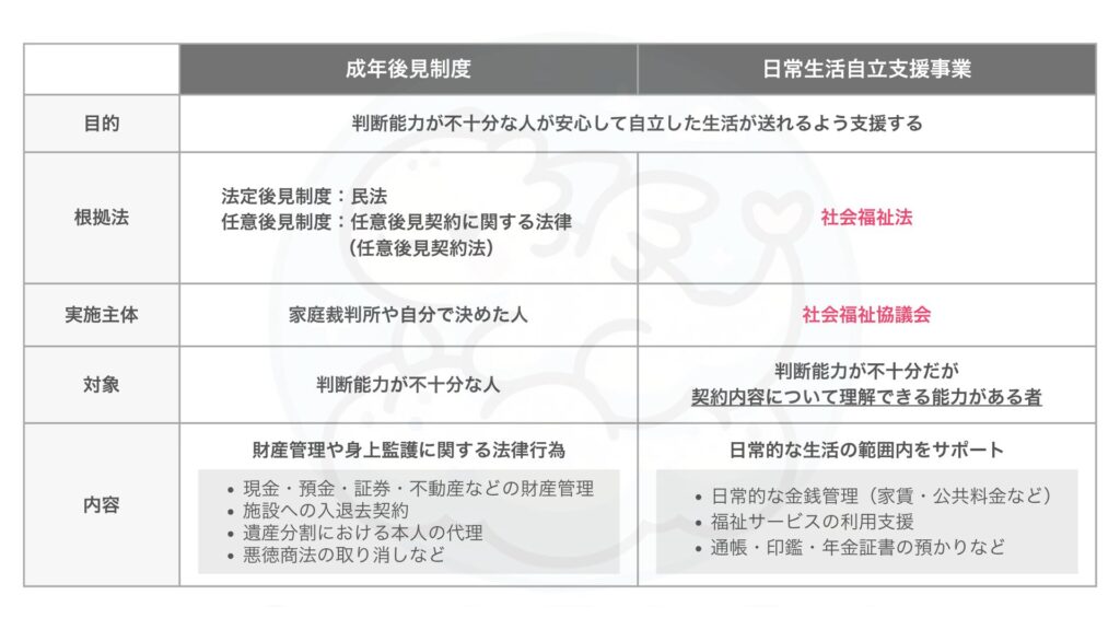 成年後見制度と日常生活自立支援事業の違いを表にまとめました。
