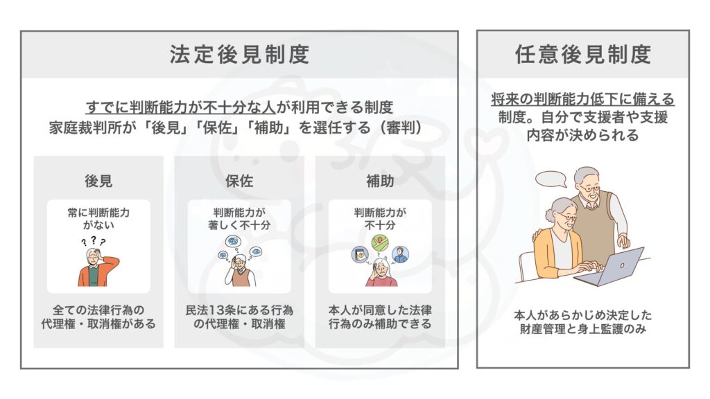 法定後見制度は、すでに判断能力が低下している人に対して後見人を定める制度です。あらかじめ後見人を決めておく制度は「任意後見制度」です。