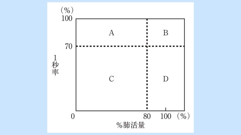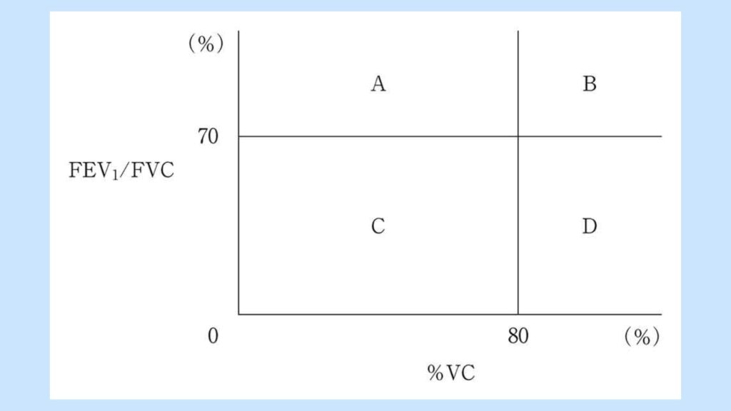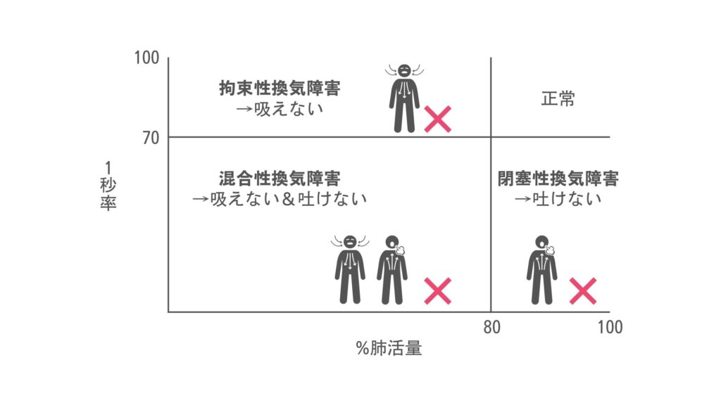 この2つのグラフを使って患者さんの肺を観察し、「拘束性障害」「閉塞性障害」「混合性障害」に分類します。