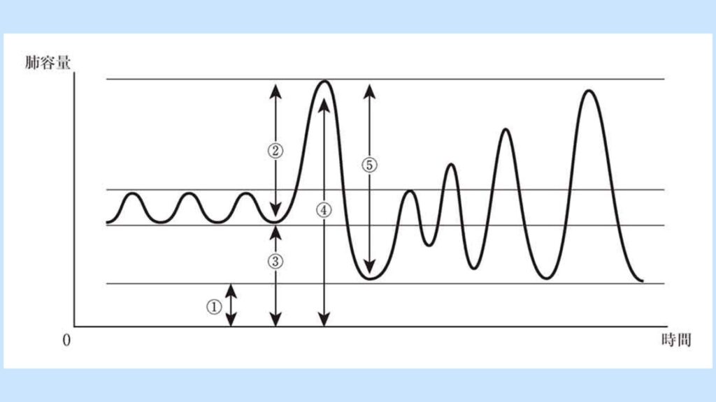 予備吸気量とは、運動時や呼吸苦など大量の換気が必要な時に、通常の呼吸(1回換気量)のあとに吸い込める空気の量です。