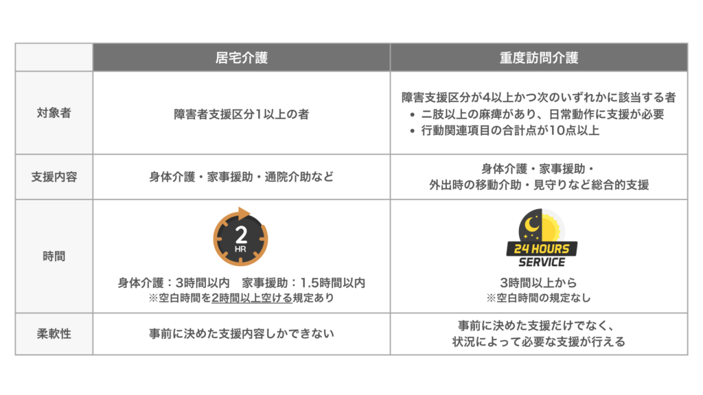 しかし、対象者・支援内容・時間・柔軟性に違いがあります。