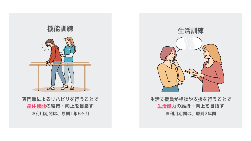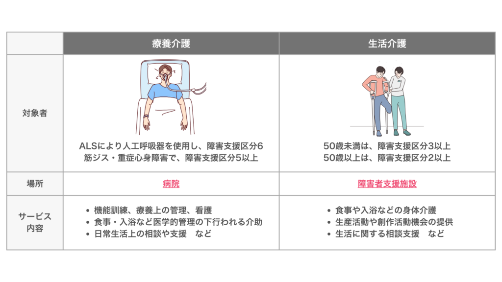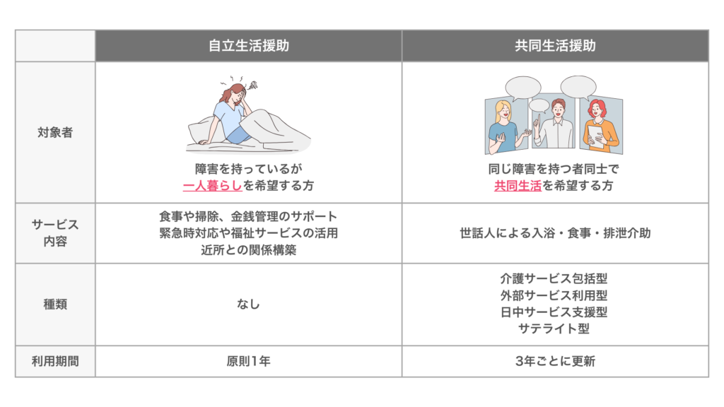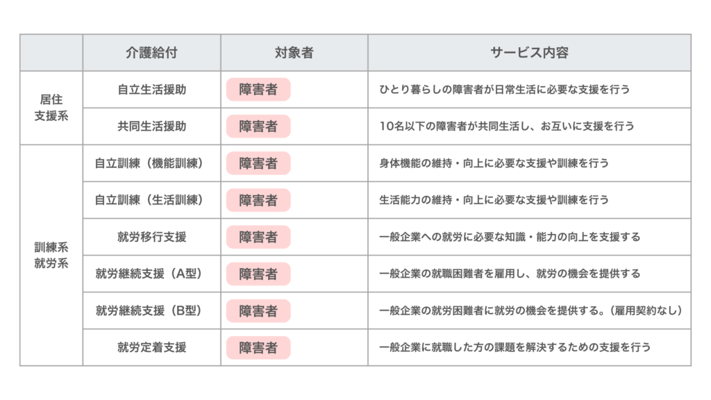対象者やサービス内容、種類、利用期間に違いがあります。