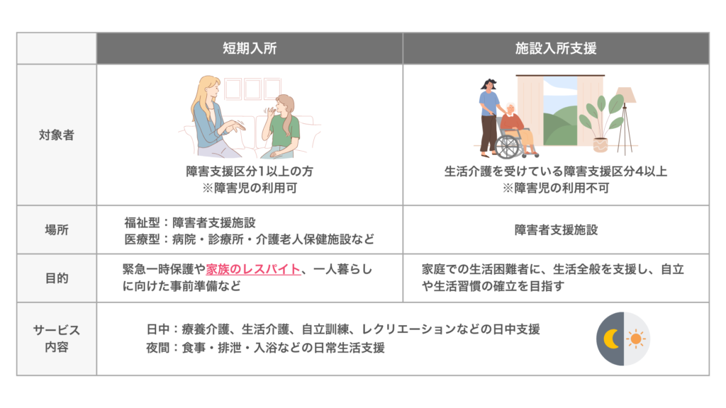 短期入所と施設入所支援は、対象者・場所・目的に違いがあります。