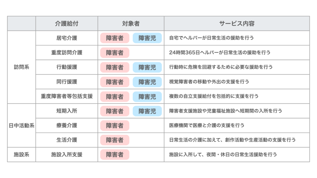 介護給付とは、障害を持つ方が介護が必要なときに利用できるサービスです。