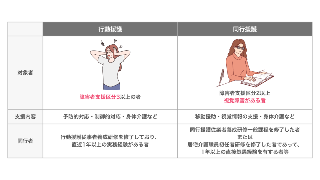 行動援護は「障害者支援区分3以上の者」であるのに対して、同行援護は「視覚障害者」を対象にしています。