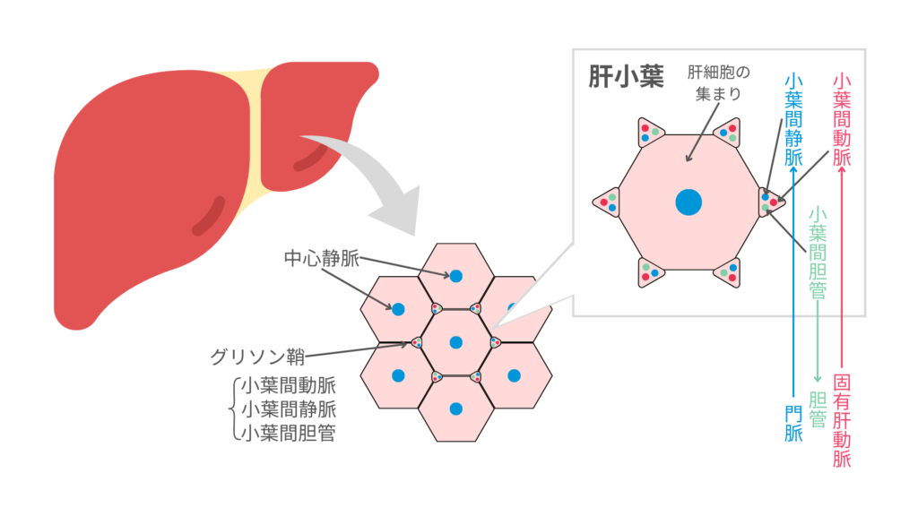 肝小葉の外側には、門脈の枝(小葉間静脈)と固有肝動脈の枝(小葉間動脈)が走行し、これらの血管と共に胆汁を運ぶ胆管の枝(小葉間胆管)が通る部分をグリソン鞘と呼びます。