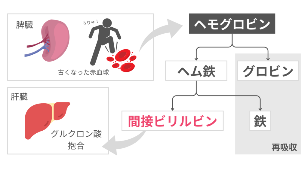 ヘモグロビンはヘムという鉄を含む部分とグロビンというタンパク質で構成され、ビリルビンはヘムの分解によって間接ビリルビンが生じます。