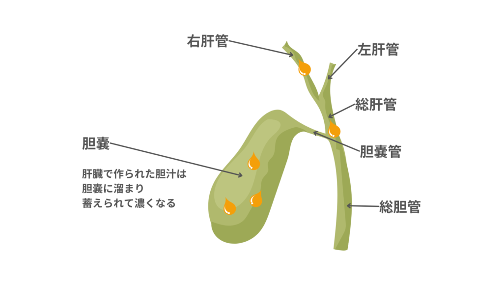 肝臓から送られてきた胆汁は胆嚢に貯蔵され、その間に水分が吸収されて濃縮されます。