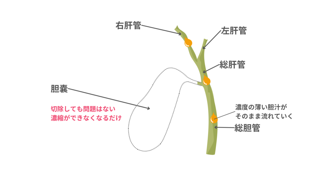 胆嚢で濃縮できなくなるだけなので、濃度の薄い胆汁が十二指腸に流れることになります。