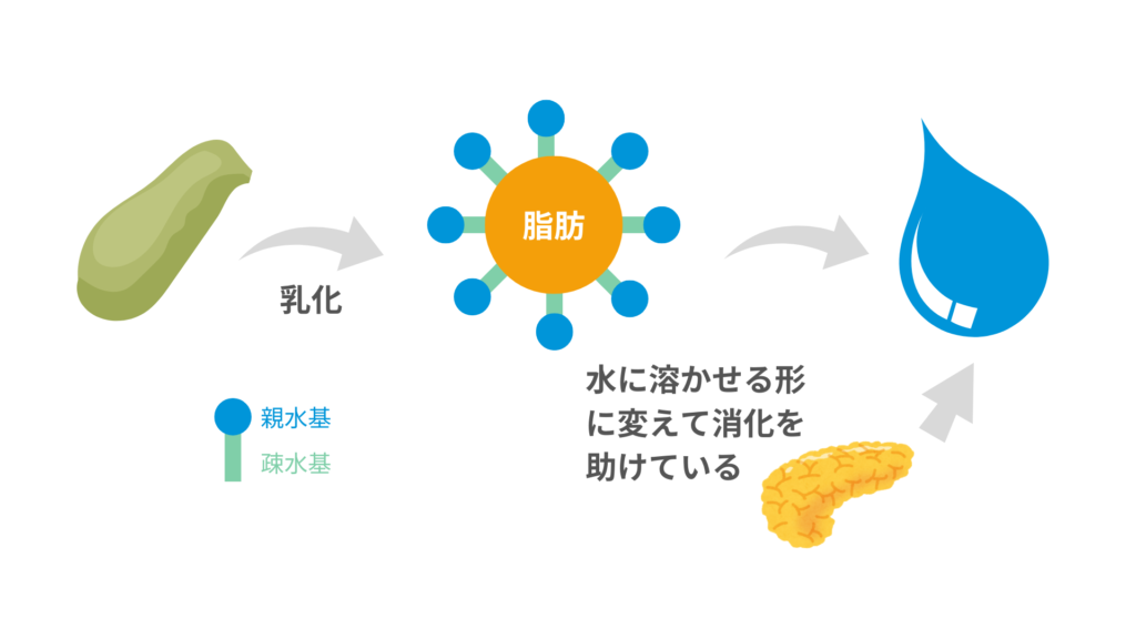 胆汁は脂肪を乳化し、消化酵素が働きやすい形にする役割があります。