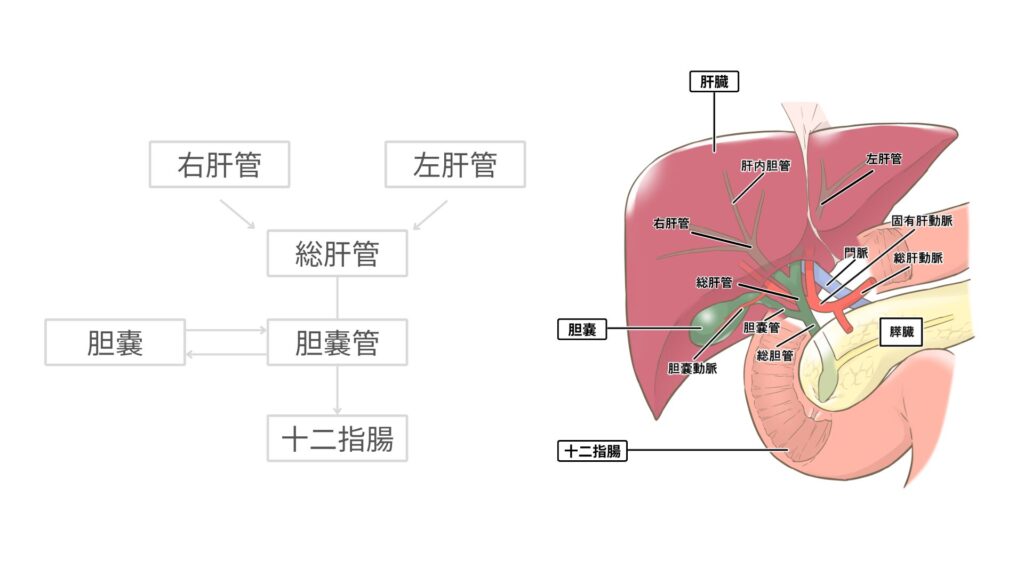 肝臓の肝細胞で生成された胆汁は、肝臓内の毛細胆管を通り、左肝管と右肝管に集約されます。