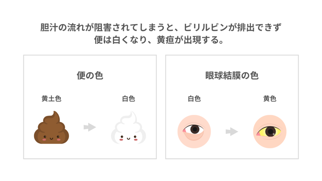 ビリルビンが混ざっていないと便が白くなったり、排出されず体内に残ったビリルビンが皮膚や眼球結膜を黄色くします。