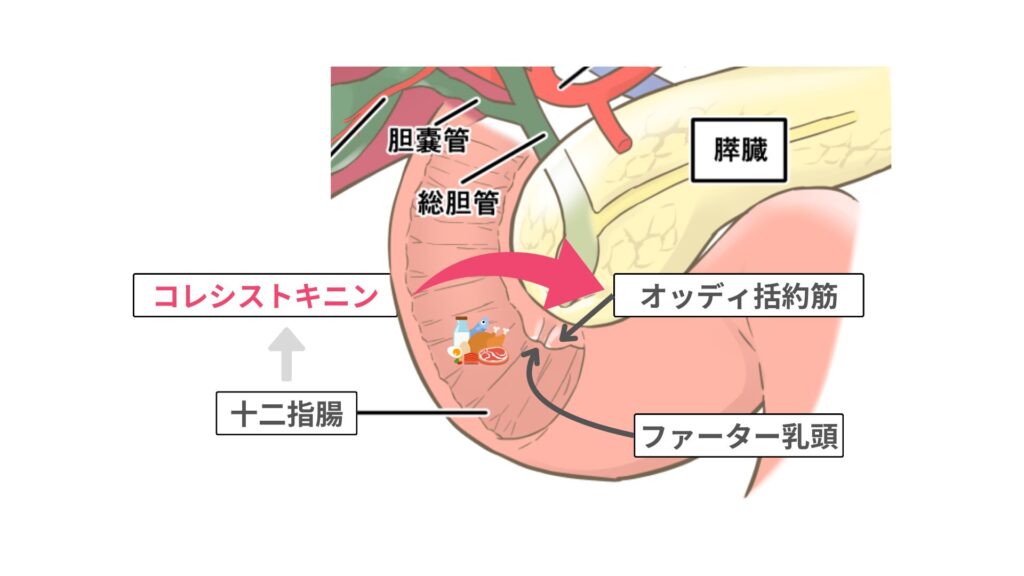 コレシストキニンはオッディ括約筋を弛緩させ、胆汁が十二指腸に流れ込むことを可能にします。