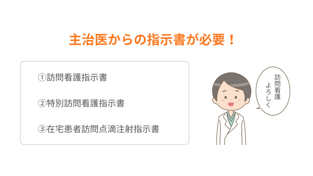 訪問看護指示書には、①訪問看護指示書、②特別訪問看護指示書、③在宅患者訪問点滴注射指示書の3種類あります。